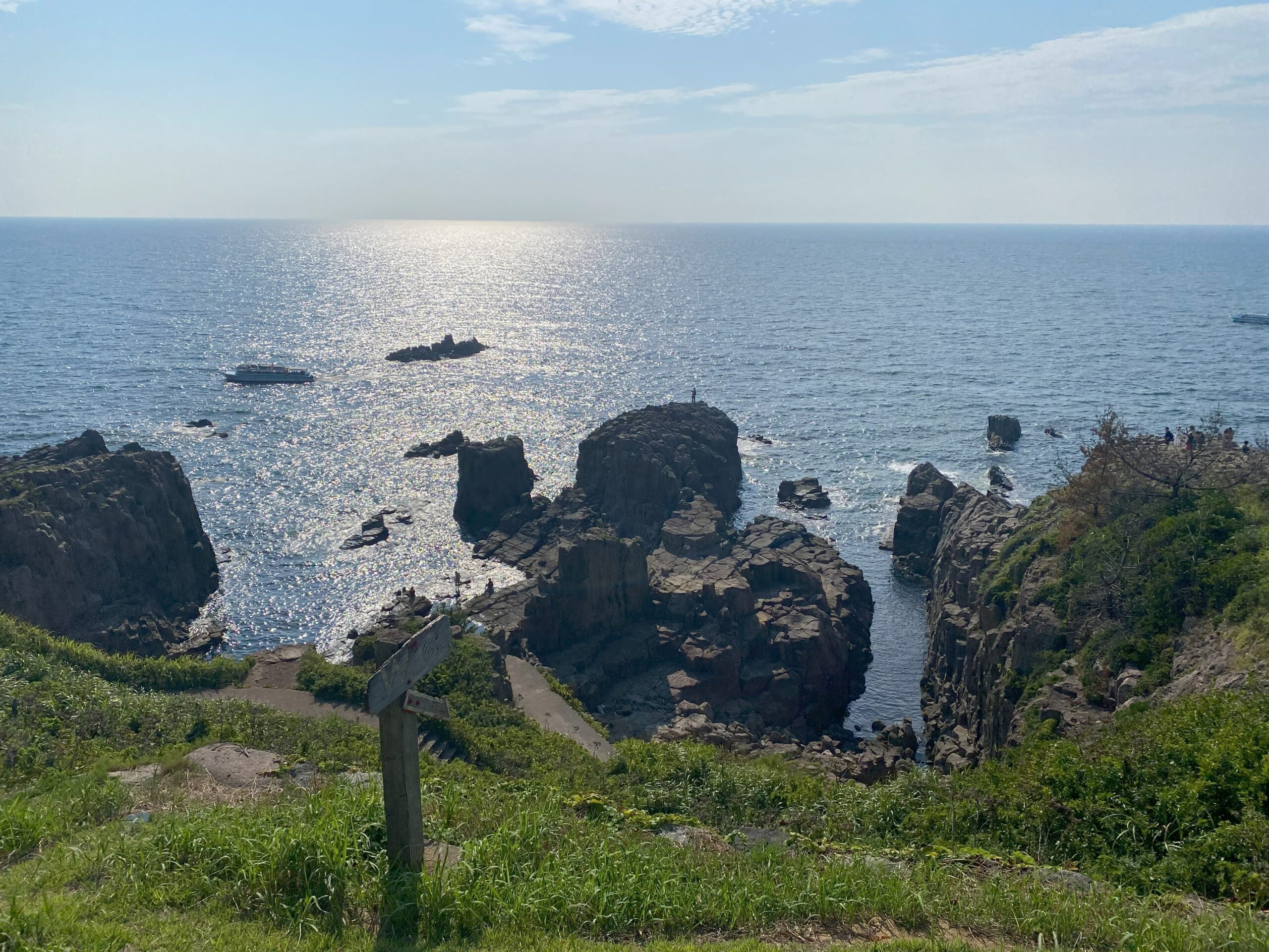 目の前に広がるのは、日本海の荒々しい波と奇岩が織りなす壮大な風景。ごつごつとした岩肌に白波が激しく打ちつける光景は、自然の力強さを間近に感じさせてくれます。特に夕刻には、沈みゆく夕日が海を赤く染め、幻想的な美しさに包まれました。