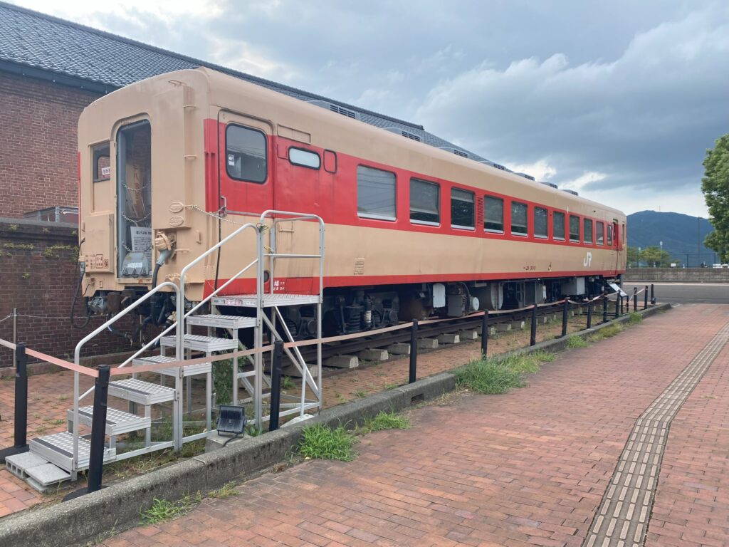 2棟の赤レンガ倉庫が並び立つ姿は、やはり写真映えします。特に夕方、レンガが柔らかなオレンジ色に染まる頃はロマンチック。また、赤レンガ倉庫隣には敦賀市が取得した日本国有鉄道の急行形気動車があります。