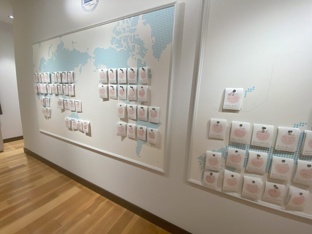 2階には交流スペースがあり、訪れた人々が付箋に思いを書き込んで貼っていける壁がありました。国内外からのメッセージが並び、平和への願いが形になっているようで心に残ります。