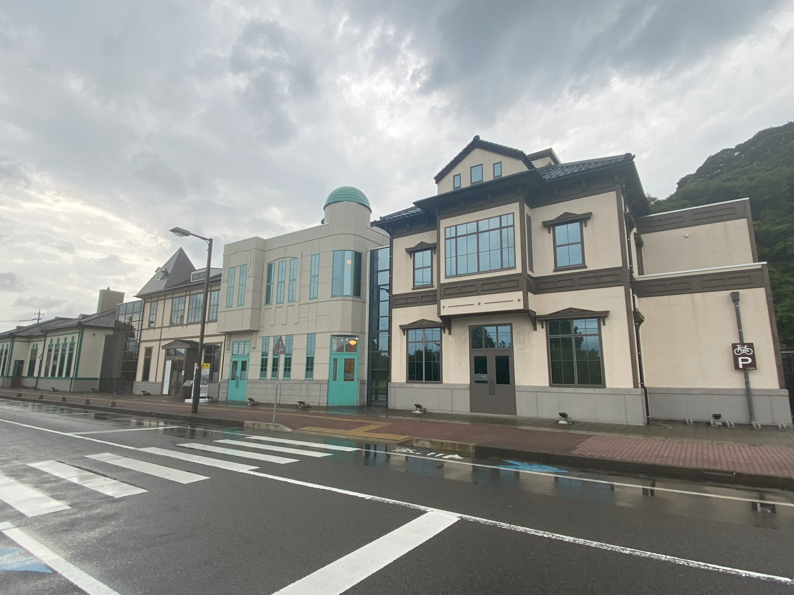 敦賀ムゼウムの建物は、緑・白・黒を基調とした洋風のモダンなデザイン。まるで港町に佇む異国の館のようで、周囲の風景と調和しながらも存在感があります。