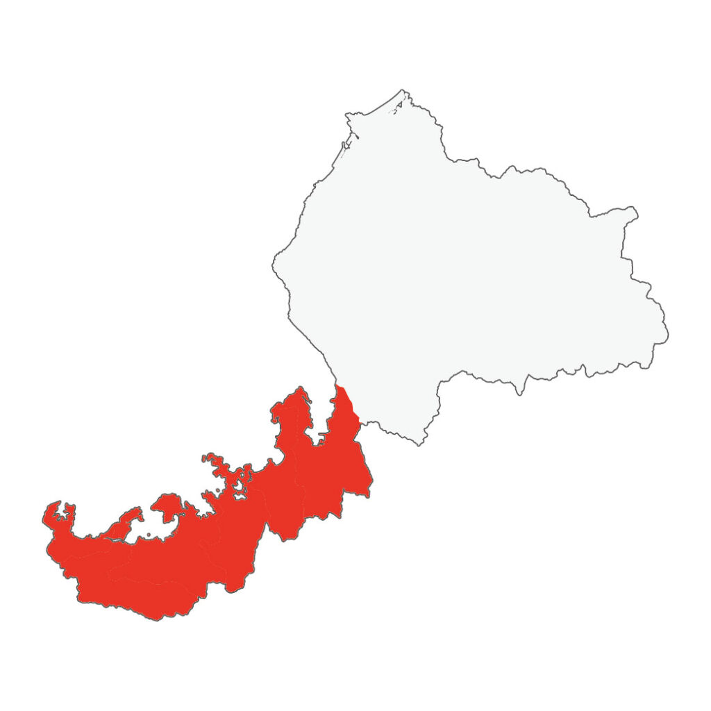 嶺南は福井県南部—おおよそ若狭湾沿岸(小浜〜敦賀)とその周辺を指します(下記の図の赤く塗りつぶしているエリア)。日本海に面し、リアス式に近い入り組んだ海岸線、大小の入り江、湖(例:三方五湖)と山地が近接するのが特徴。海産物の宝庫であり、古くは京都との交易を担った「鯖街道」や港町の歴史が色濃く残ります。大都市からのアクセスが良く、自然景観・歴史文化・食がバランスよく楽しめる点が最大の魅力です。
