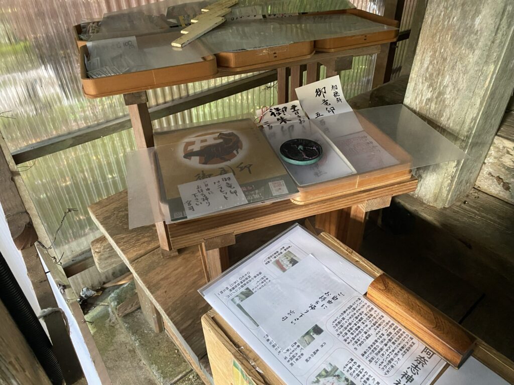 阿奈志神社では、社務所の常駐はないようですが、本殿の賽銭箱の隣にお守り・おみくじ・御朱印が置かれています。また、福井ならではの「御竜印」も置かれており、さらに御竜印についてのパンフレットも用意されていました。